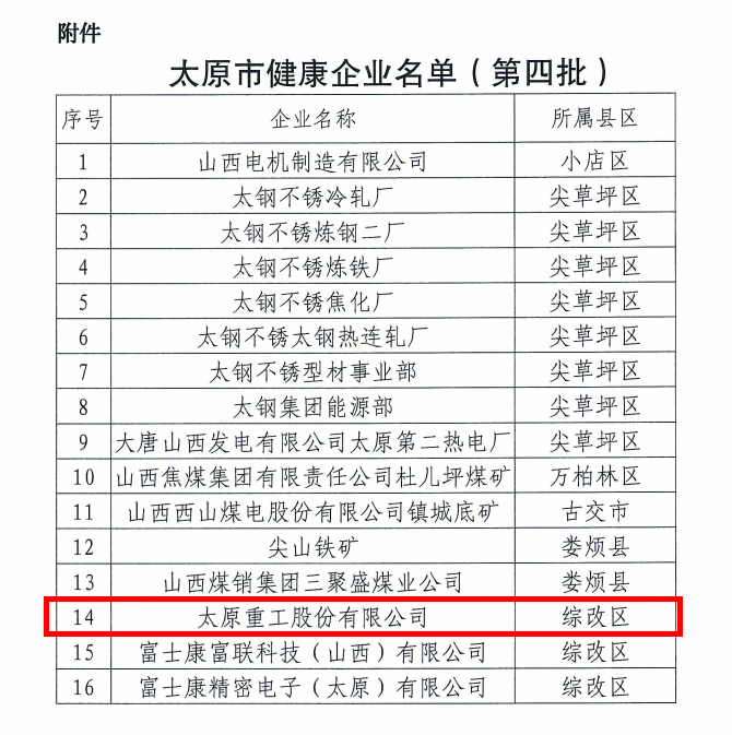 近日,太原市健康委員會(huì)公布了第四批健康企業(yè)名單,太原重工股份有限公司憑借卓越的健康管理理念和實(shí)踐成果,成功獲評(píng)太原市“健康企業(yè)”稱號(hào)。