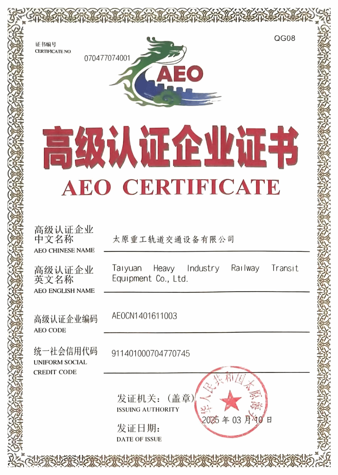 自此,太重軌道公司能夠享受優(yōu)先通關(guān)、降低查驗(yàn)率、簡(jiǎn)化單證審核等便利化措施,進(jìn)一步縮短貨物通關(guān)時(shí)間、大幅提升通關(guān)效率,對(duì)降低通關(guān)成本、提升用戶滿意度具有積極意義。這一認(rèn)證將有助于公司進(jìn)軍高端國(guó)際市場(chǎng),特別是在供應(yīng)鏈安全標(biāo)準(zhǔn)嚴(yán)格的國(guó)家和地區(qū),為業(yè)務(wù)開展提供有力支撐。